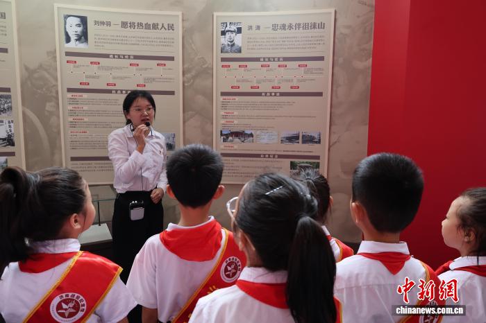 8月27日,山東濟(jì)南,講解員向?qū)W生們介紹泰安市抗戰(zhàn)英烈故事。當(dāng)天,山東省黃河流域九市抗戰(zhàn)英烈事跡展開展,匯聚山東沿黃九市在抗戰(zhàn)時(shí)期涌現(xiàn)的45名英烈事跡和實(shí)物遺存,帶觀眾回望烽火歲月,感知英烈精神。中新社記者 趙曉 攝