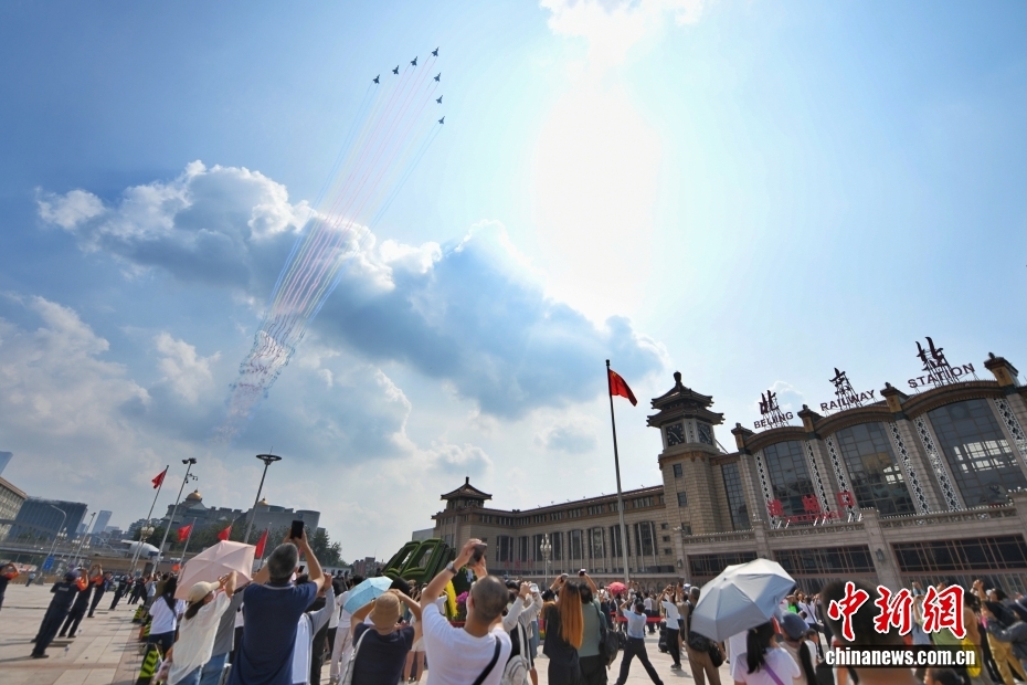 9月3日,紀(jì)念中國(guó)人民抗日戰(zhàn)爭(zhēng)暨世界反法西斯戰(zhàn)爭(zhēng)勝利80周年大會(huì)在北京隆重舉行。圖為受閱的空中梯隊(duì)從北京站上空飛過。中新社記者 楊華峰 攝