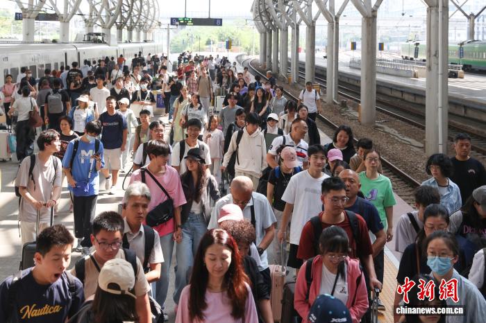 10月8日,江蘇南京,旅客們?cè)诨疖囌境鲂。?dāng)日是國(guó)慶中秋假期最后一天,長(zhǎng)三角鐵路迎來(lái)返程客流最高峰。中新社記者 泱波 攝