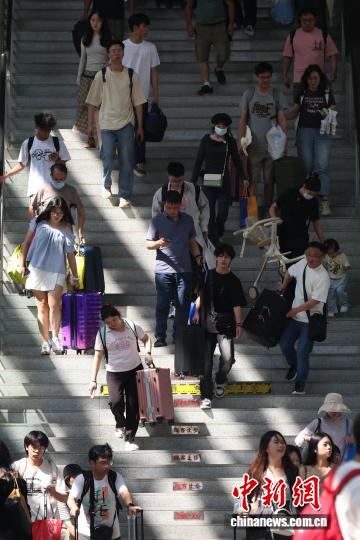 10月8日,江蘇南京,旅客們?cè)诨疖?chē)站出行。當(dāng)日是國(guó)慶中秋假期最后一天,長(zhǎng)三角鐵路迎來(lái)返程客流最高峰。中新社記者 泱波 攝