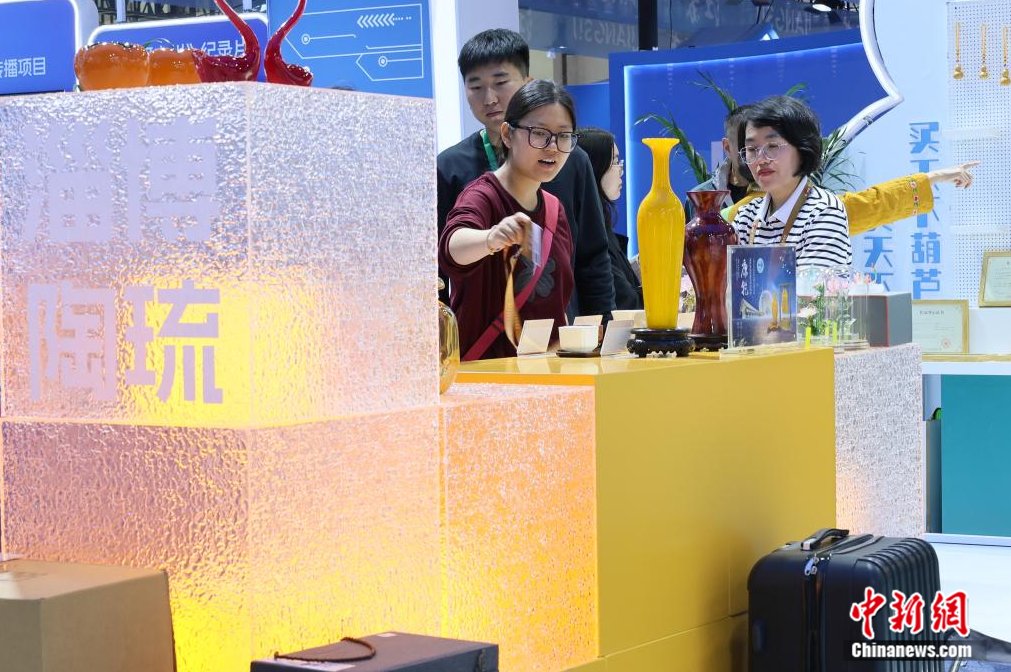 圖為參會嘉賓在展館參觀,欣賞淄博琉璃。中新社發(fā) 張孝鵬 攝