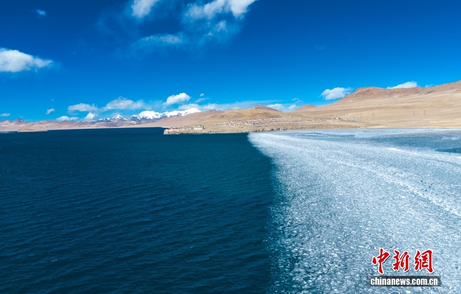 近日,西藏山南市浪卡子縣,普莫雍措部分水面結冰形成冰推景觀。圖/視覺中國