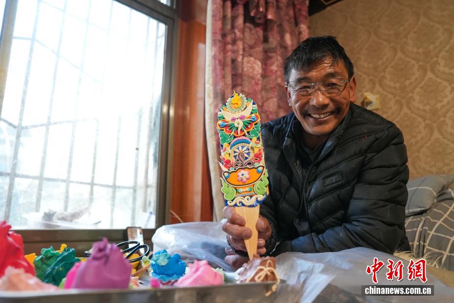 2月4日,隨著藏歷新年臨近,拉薩街頭年味漸濃,年貨市場(chǎng)上的“孜扎”迎來(lái)熱銷(xiāo)。酥油花藏語(yǔ)稱(chēng)“孜扎”,是藏族民眾家中必備的年貨。圖為手工藝人展示制作完成的酥油花。貢確 攝