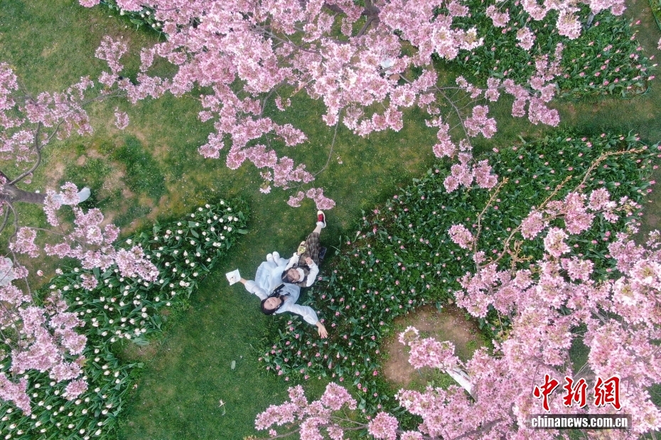 3月13日,江西省南昌縣鳳凰溝,游客在盛開的櫻花下游玩。連日來,南昌春光明媚,吸引了眾多市民游客踏春賞花,享受美好時光。(無人機(jī)照片)中新社記者 劉力鑫 攝