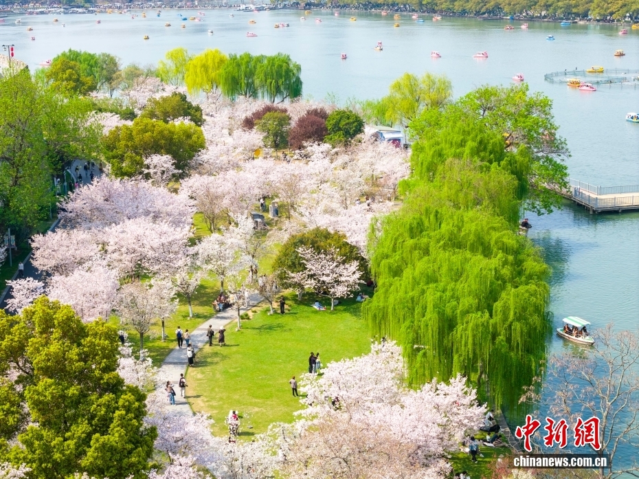 3月29日,江蘇南京玄武湖公園內(nèi)櫻花競相綻放,如云似霞,吸引眾多游客前來踏青賞花,樂享春光。圖/CNSphoto 史俊 攝