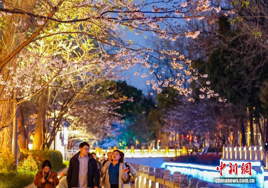 3月23日晚,江蘇南京,太平北路珍珠河畔櫻花盛開,成為夜色中的獨(dú)特風(fēng)景。中新社記者 泱波 攝