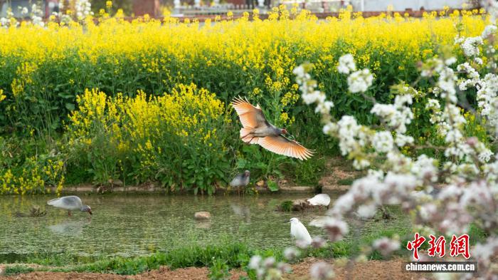 近日,“朱鹮之鄉(xiāng)”陜西省漢中市洋縣春意盎然,朱鹮或在花間翩然飛過,或在花田枝頭棲息,構(gòu)成一幅和諧美好的生態(tài)畫卷。圖為朱鹮從油菜花田上飛過。劉齊軒 攝