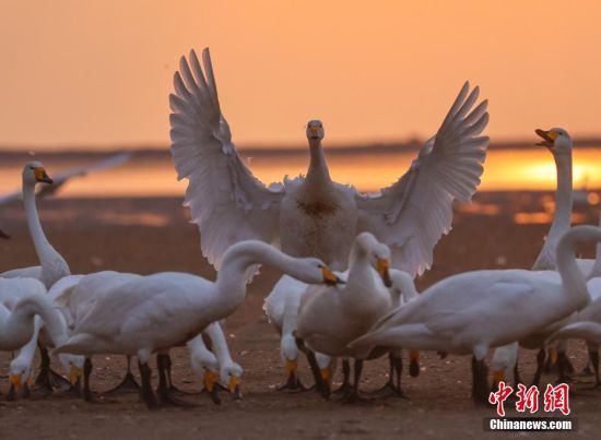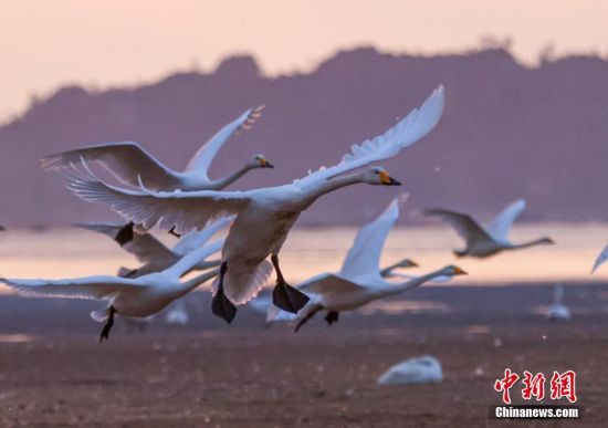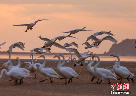 2月23日,在山東榮成大天鵝國家級自然保護(hù)區(qū)天鵝湖,成群的大天鵝在練習(xí)飛行,為長途遷徙“熱身”。近期,天鵝湖上空頻繁出現(xiàn)大天鵝編隊(duì)飛行的壯觀景象。每年10月中下旬,上萬只來自西伯利亞等地的大天鵝飛臨“中國大天鵝之鄉(xiāng)”山東榮成越冬,翌年3月回遷。