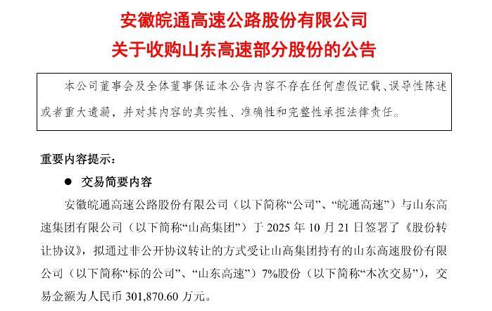 近日,皖通高速發(fā)布公告稱,擬通過非公開協(xié)議轉讓方式,受讓山東高速集團有限公司(簡稱“山高集團”)持有的山東高速股份有限公司(簡稱“山東高速”)7%的股份。本次交易涉及股份數量達3.38億股,轉讓價格確定為每股8.92元,總交易金額達30.19億元。