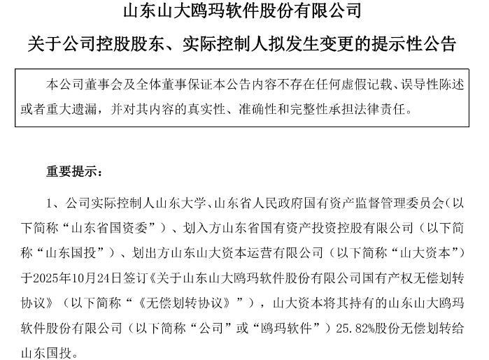 山大地緯公告稱(chēng),公司實(shí)際控制人山東大學(xué)、山東省國(guó)資委、劃入方山東高速集團(tuán)、劃出方山大資本于2025年10月24日簽訂《無(wú)償劃轉(zhuǎn)協(xié)議》,山大資本將持有的公司24.59%股份無(wú)償劃轉(zhuǎn)給山東高速集團(tuán)。