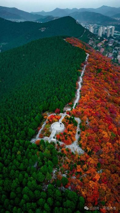 濟(jì)南蝎子山形似翹尾蝎子,靜臥在城市脈絡(luò)中。山脊天然劃界,將秋意一分為二,北坡松柏疊翠,南坡黃櫨燃紅,航拍視角下,蝎子山就像一鍋煮沸的秋日“鴛鴦鍋”,每一幀都是壁紙。