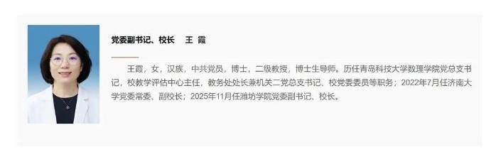 近日,濰坊學(xué)院更新現(xiàn)任領(lǐng)導(dǎo)信息,王霞已任濰坊學(xué)院黨委副書記、校長(zhǎng)。