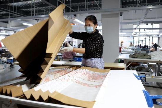 在寬敞明亮的生產(chǎn)車間里,長達(dá)300多米的生產(chǎn)線有序運(yùn)轉(zhuǎn),縫紉、拼接、包裝、裝車,一派繁忙景象。
