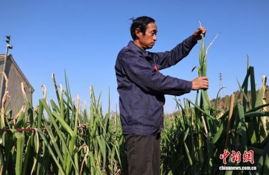 蔥農(nóng)在田間查看大蔥長勢。 趙曉 攝