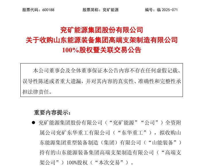 11月27日,兗礦能源集團(tuán)股份有限公司(簡(jiǎn)稱(chēng)“兗礦能源”)發(fā)布公告,全資附屬公司兗礦東華重工有限公司(簡(jiǎn)稱(chēng)“東華重工”)以34484.74萬(wàn)元,收購(gòu)山東能源集團(tuán)重型裝備制造(集團(tuán))有限公司(簡(jiǎn)稱(chēng)“山能裝備”)持有的山東能源裝備集團(tuán)高端支架制造有限公司(簡(jiǎn)稱(chēng)“高端支架公司”)100%股權(quán)。