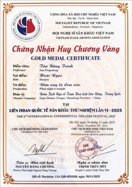 2025年第六屆國際實驗戲劇節(jié)于11月20日至30日在越南寧平舉辦,來自十多個國家的29個劇種劇目入圍最終決賽圈,最終評選出特等獎兩個、一等獎8個。沾化漁鼓戲《今夕何夕》因去年在東盟國際戲劇周的驚艷亮相,成為本屆戲劇節(jié)決賽階段公認(rèn)的種子劇目,最終憑借高藝術(shù)水準(zhǔn)、高觀眾口碑,贏得國際評委團(tuán)和現(xiàn)場觀眾的一致稱贊,斬獲最高獎,成為最大贏家。
