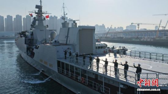 中新社青島12月4日電 越南海軍“陳興道”號(hào)導(dǎo)彈護(hù)衛(wèi)艦4日上午結(jié)束訪問交流活動(dòng),離開中國(guó)青島某軍港。中方在碼頭舉行歡送儀式,中國(guó)人民解放軍北部戰(zhàn)區(qū)海軍官兵代表參加。