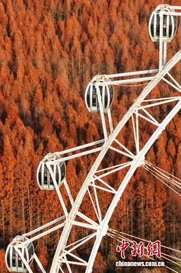 12月1日,在日照海濱國家森林公園,水杉裹著焦糖色“盛裝”,與摩天輪的雪白形成鮮明對比。(無人機照片)王鑫 攝