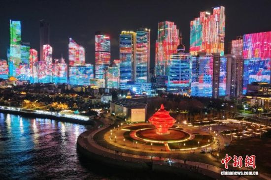 12月2日晚,青島奧帆中心流淌璀璨光影。(無人機照片)王鑫 攝