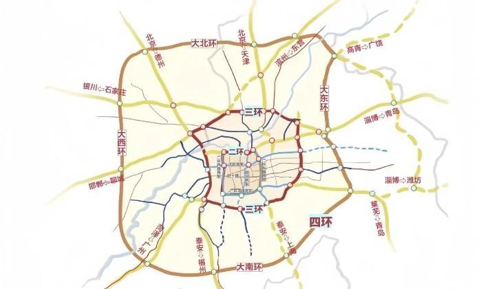 “三環(huán)”為濟(jì)南繞城高速G2001,即繞城高速東線、繞城高速南線、京臺高速、濟(jì)聊高速、青銀高速等5條高速公路圍成的環(huán)路。