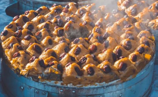 濟(jì)南仲宮大集上的年糕冒著熱氣。(資料圖)濟(jì)南市文化和旅游局供圖 周博文 攝