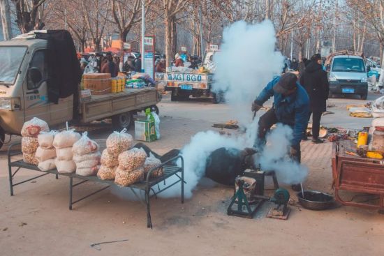 濟(jì)南柳埠大集上的攤主正在制作爆米花。(資料圖)濟(jì)南市文化和旅游局供圖 周博文 攝
