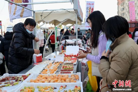 12月8日,年輕人在臨沂曹洼大集上購(gòu)買(mǎi)糖葫蘆。李明芮 攝