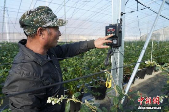 與西嵬石村相隔十余里的埠口村智慧藍(lán)莓基地,也是一番忙碌景象。“大棚的溫度、濕度,全在最佳范圍內(nèi),系統(tǒng)會自動澆水調(diào)溫,根本不用咱們操心。”村支部副書記李海明正拿著手機(jī)操作物聯(lián)網(wǎng)監(jiān)測系統(tǒng)。