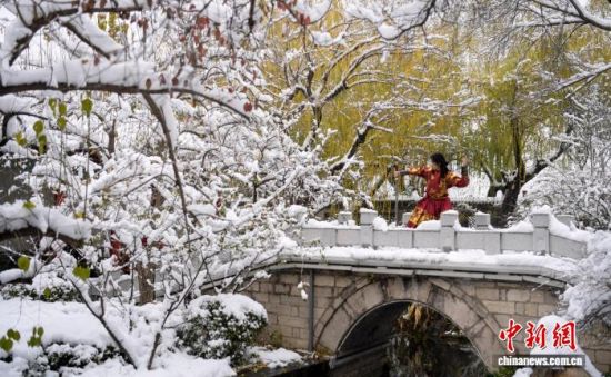 12月13日,濟(jì)南大明湖畔,市民在雪景中舞劍。中新社記者 張勇 攝