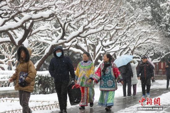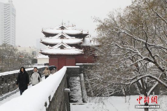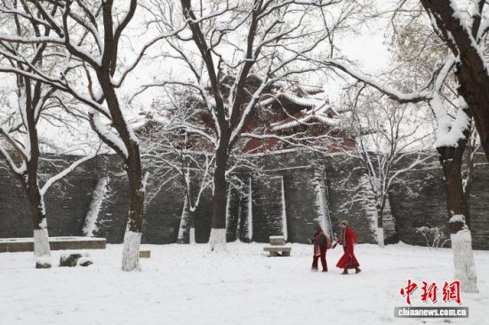 12月13日,山東泰安,岱廟銀裝素裹,白雪覆蓋青瓦飛檐,紅墻映雪,吸引游客駐足觀賞。陳陽 攝