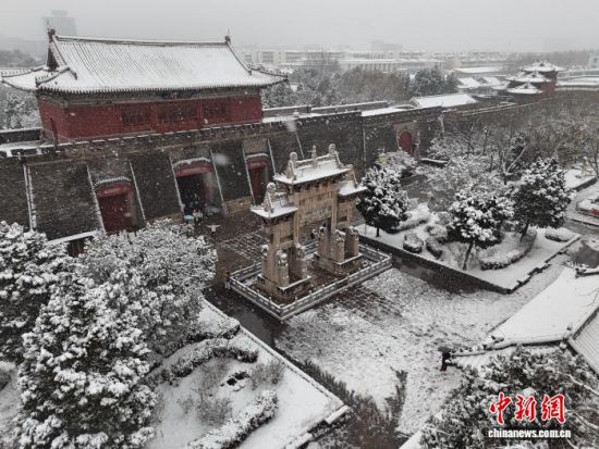 12月13日,山東泰安,岱廟銀裝素裹,白雪覆蓋青瓦飛檐,紅墻映雪,古建更顯雅致。陳陽 攝