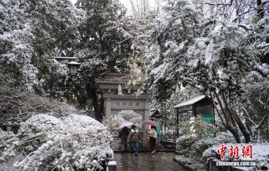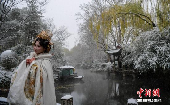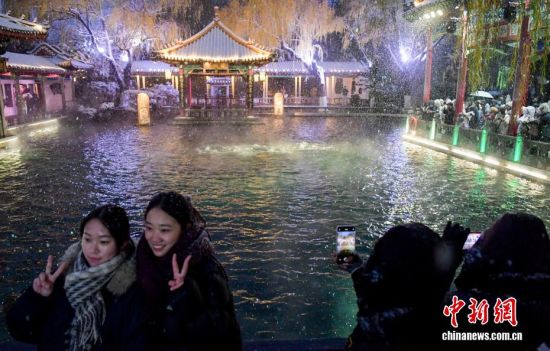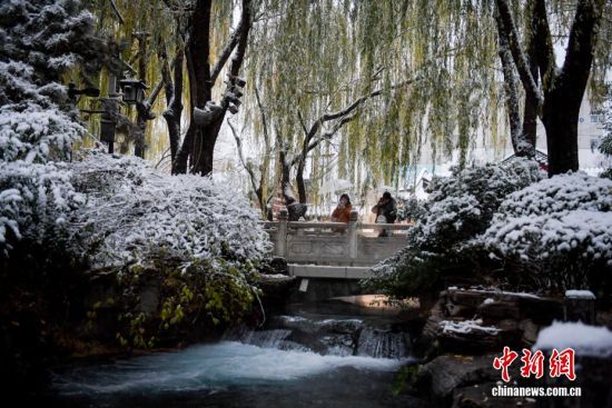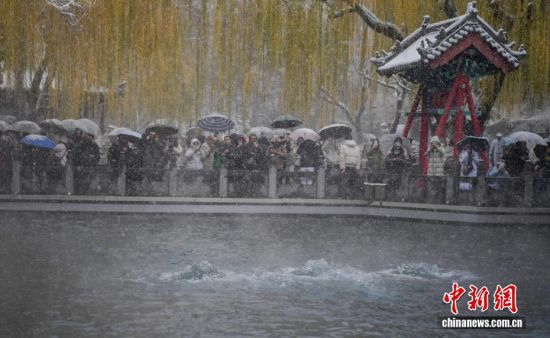 12月12日,游客在濟(jì)南趵突泉公園里賞雪。當(dāng)日,山東濟(jì)南迎來(lái)2025年入冬以來(lái)首場(chǎng)降雪,濟(jì)南趵突泉公園里白雪皚皚,美不勝收。中新社記者 張勇 攝