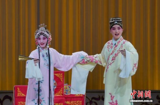 5月21日晚,第32屆中國戲劇梅花獎在上海揭曉,尹春媛(左)和搭檔在舞臺上表演《玩會跳船》。山東省柳子劇團供圖