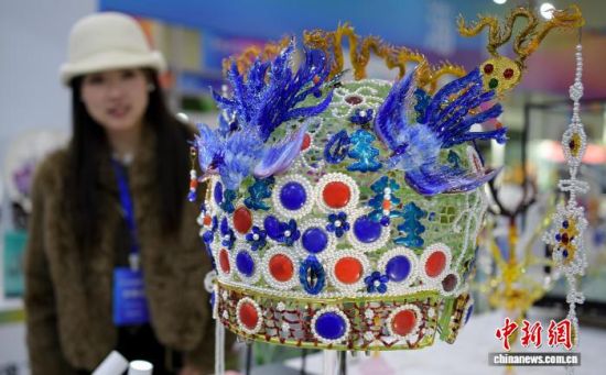 12月26日,觀眾在展會上觀賞“琉璃鳳冠”。中新社記者 張勇 攝
