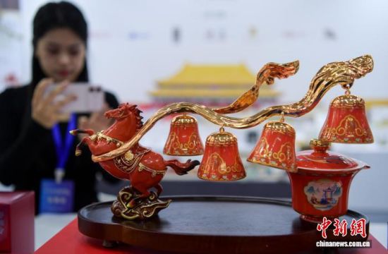 12月26日,觀眾在展會上觀賞銅合金燒色工藝品“躍馬鳴祥茶器”。中新社記者 張勇 攝