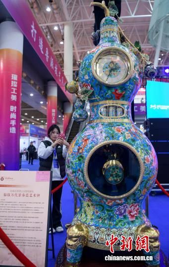 12月26日,觀眾在展會上觀賞“福祿萬代景泰藍鐘”。中新社記者 張勇 攝