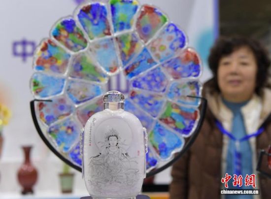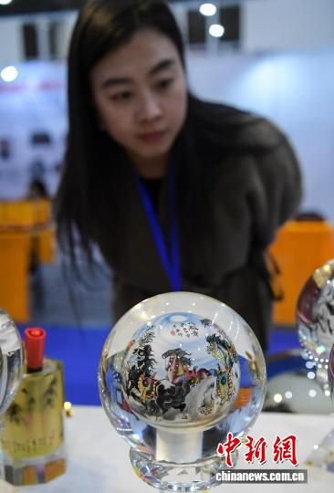 12月26日,觀眾在展會上觀賞水晶內(nèi)畫“八駿圖”。中新社記者 張勇 攝