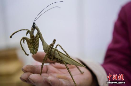 12月26日,手工藝人展示草編“螳螂”。中新社記者 張勇 攝