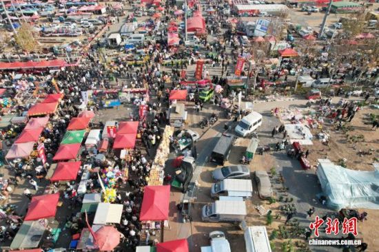12月8日,山東省臨沂市臨沭縣,民眾暢游曹洼大集。近期,曹洼大集憑借超高性?xún)r(jià)比的特色美食、濃郁的民俗氛圍、線(xiàn)上線(xiàn)下聯(lián)動(dòng)的鮮活場(chǎng)景火爆全網(wǎng)。(無(wú)人機(jī)照片) 中新社記者 王峰 攝