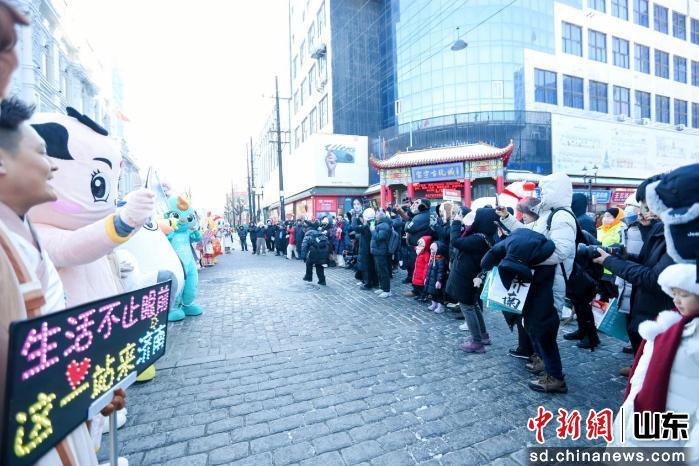 活動(dòng)的熱情并未止步于冰雪大世界的舞臺(tái),在充滿風(fēng)情的哈爾濱巴洛克風(fēng)情街,山東文旅推介團(tuán)將“好客山東”的舞臺(tái)進(jìn)一步延伸。伴隨著《相親相愛》的熟悉旋律,十六地市文旅推介官集體亮相,用各具特色的口號(hào)向冰城市民和全國游客發(fā)出誠摯邀請(qǐng),“泉城濟(jì)南歡迎您”“活力海洋之都青島歡迎您”“進(jìn)淄趕烤歡迎您”……一句句熱情洋溢的邀約,與歌聲交融,在街區(qū)上空回蕩;顒(dòng)現(xiàn)場(chǎng),推介官們走入人群,將蘊(yùn)含山東各地特色的小禮物送到游客手中,實(shí)現(xiàn)了一場(chǎng)從“舞臺(tái)表演”到“街頭互動(dòng)”的無縫銜接。這份“邊走邊唱邊送”的親切,讓“好客山東”的品牌形象更加可觸、可感、可體驗(yàn),也讓冰城的冬天因齊魯風(fēng)情而格外溫暖。