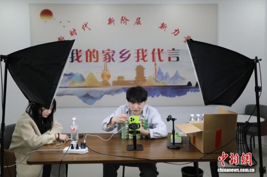 2025年3月27日,在臨沂市蘭山區(qū),網(wǎng)絡(luò)主播劉振(右一)在“魯商中心·同心薈”新階層工作站的共享直播間里售賣(mài)當(dāng)?shù)厣a(chǎn)的寵物零食。王采怡 攝