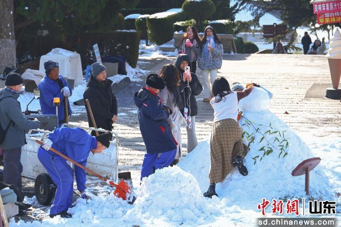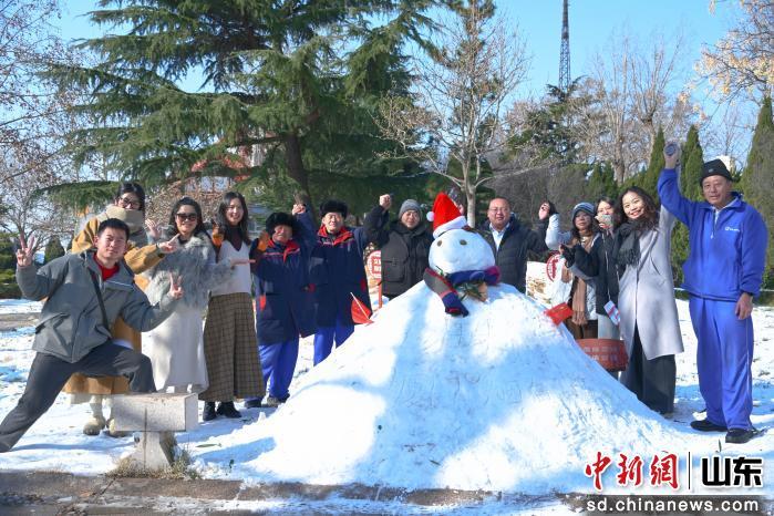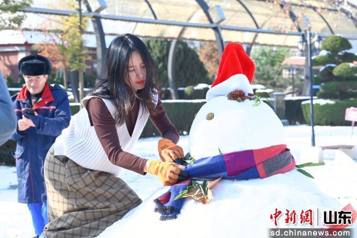 圖為游客在煙臺(tái)山景區(qū)內(nèi)堆雪人。曲正揚(yáng) 攝