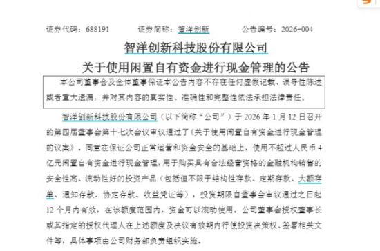 1月12日,智洋創(chuàng)新召開第四屆董事會(huì)第十七次會(huì)議審議通過(guò)了《關(guān)于使用閑置自有資金進(jìn)行現(xiàn)金管理的議案》。