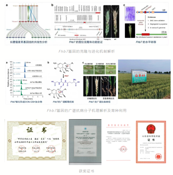 小麥赤霉病被稱為小麥“癌癥”,可導(dǎo)致小麥減產(chǎn)甚至絕收,是全球小麥生產(chǎn)中面臨的重大病害。其產(chǎn)生的嘔吐毒素(三類致癌物質(zhì))嚴(yán)重威脅世界糧食生產(chǎn)和食品安全。該成果在國際上率先發(fā)現(xiàn)并成功克隆了長穗偃麥草抗赤霉病主效基因Fhb7,首次闡明了其廣譜抗性的分子機(jī)制,并成功將該基因轉(zhuǎn)移至小麥品種,對解決小麥赤霉病這一重大國際性難題做出了突破性貢獻(xiàn)。目前,攜帶Fhb7基因的抗病種質(zhì)已共享至全國育種單位利用,成果團(tuán)隊培育的兼抗赤霉病與莖基腐病新品種山農(nóng)48已成為山東省主推品種。