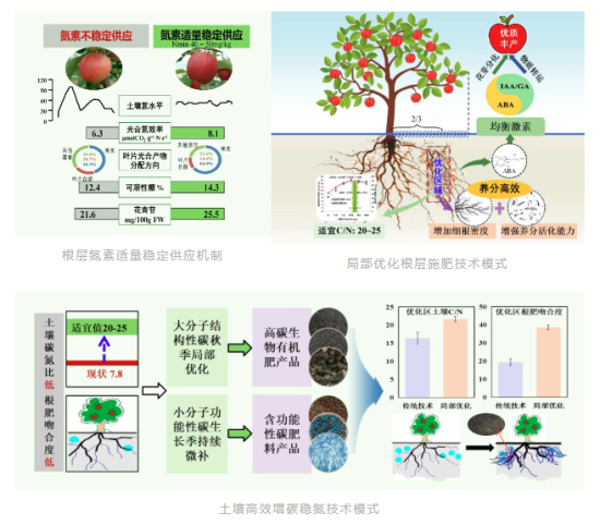蘋果園化肥施用過量不僅造成果實品質(zhì)下降、肥料利用率低,而且?guī)憝h(huán)境污染等系列問題。該成果針對我國蘋果園化肥施用過量這一制約產(chǎn)業(yè)綠色發(fā)展的瓶頸問題,歷經(jīng)15年,闡明了根層養(yǎng)分適量穩(wěn)定供應(yīng)協(xié)同實現(xiàn)養(yǎng)分高效與優(yōu)質(zhì)豐產(chǎn)的機(jī)制,發(fā)明了局部優(yōu)化根層施肥、總量控制追肥后移等施肥新方法,創(chuàng)制了實現(xiàn)根層氮素穩(wěn)定供應(yīng)的系列肥料和裝備,集成了“一穩(wěn)二調(diào)三優(yōu)化”蘋果化肥減量提質(zhì)增效綠色生產(chǎn)技術(shù),實現(xiàn)減氮26.8%,增產(chǎn)6.6%,優(yōu)質(zhì)果率提升7.4%,在山東、陜西等地推廣應(yīng)用659萬畝,有力推動了蘋果綠色施肥技術(shù)進(jìn)步。