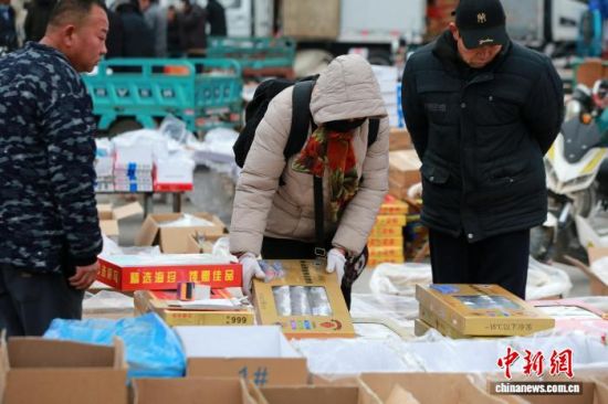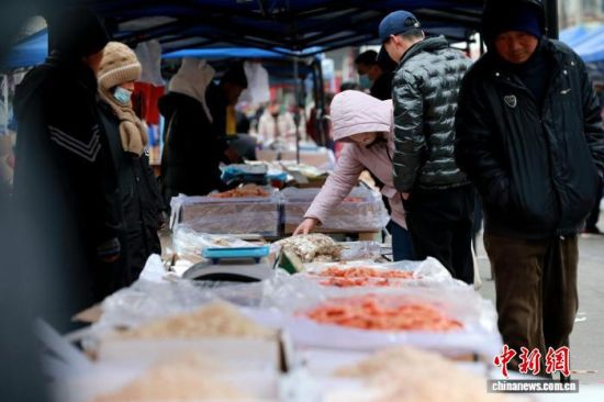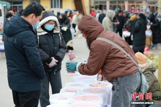 1月29日,山東省濱州市沾化區(qū),春節(jié)將近,市民在馮家鎮(zhèn)“黃河大集”上購買特產(chǎn)蝦醬。中新社記者 梁犇 攝