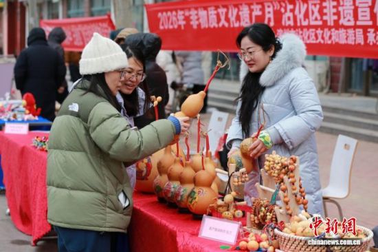 1月29日,山東省濱州市沾化區(qū),市民在馮家鎮(zhèn)“黃河大集”上選購葫蘆。本次“黃河大集”邀請了藍花印布、葫蘆烙畫、粗陶等非遺現(xiàn)場展示。中新社記者 梁犇 攝