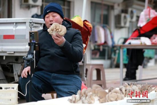 1月29日,山東省濱州市沾化區(qū),攤主在馮家鎮(zhèn)“黃河大集”上通過線上直播銷售自產(chǎn)蘑菇。中新社記者 梁犇 攝