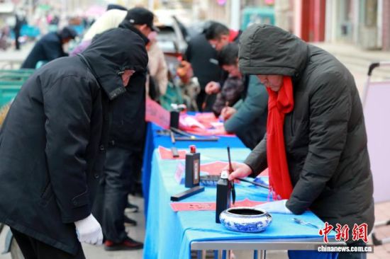 1月29日,山東省濱州市沾化區(qū)馮家鎮(zhèn),書法愛好者在“黃河大集”上免費為市民寫春聯(lián)。中新社記者 梁犇 攝