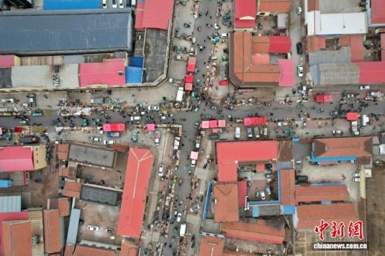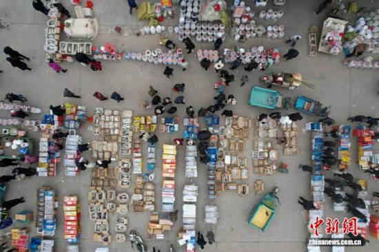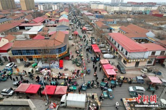 1月29日,山東省濱州市沾化區(qū),春節(jié)將近,馮家鎮(zhèn)“黃河大集”吸引眾多市民前來采購年貨。(無人機照片)中新社記者 梁犇 攝